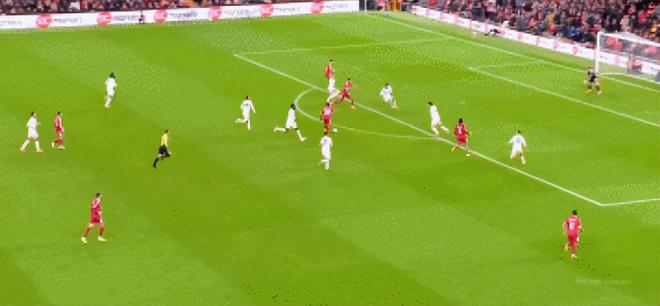 第二分,是赫拉芬貝赫經(jīng)典的大力炮轟。問題類似在這個視角可看到,利物浦的前鋒引導(dǎo)對方中衛(wèi)跑開了,兩個邊鋒拉邊及中場的后插上,這不就是奪冠賽季主要套路。