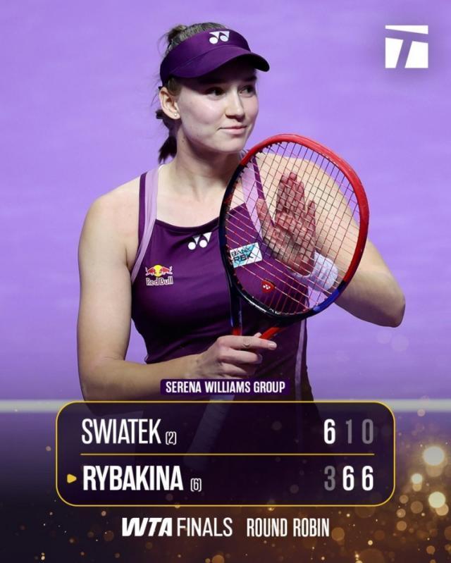 利雅得WTA年終總決賽單打小威廉姆斯組焦點戰(zhàn),萊巴金娜2比1送蛋逆轉(zhuǎn)斯瓦泰克。6號種子萊巴金娜以3比6 6比1 6比0強勢逆轉(zhuǎn)2號種子斯瓦泰克,終結(jié)了本賽季對后者的四連敗。她將年終小組賽戰(zhàn)績刷新為2比0,也將近期的連勝擴大到了八場。