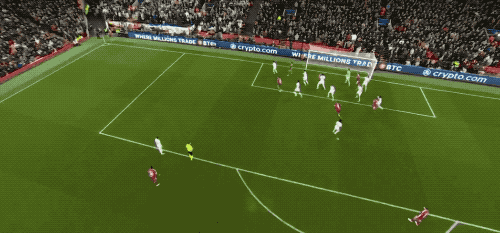 第9分鐘,維爾茨前場積極逼搶,從赫伊森腳下斷球,索博斯洛伊傳球,麥卡利斯特在卡馬文加的干擾下,放了高射炮。